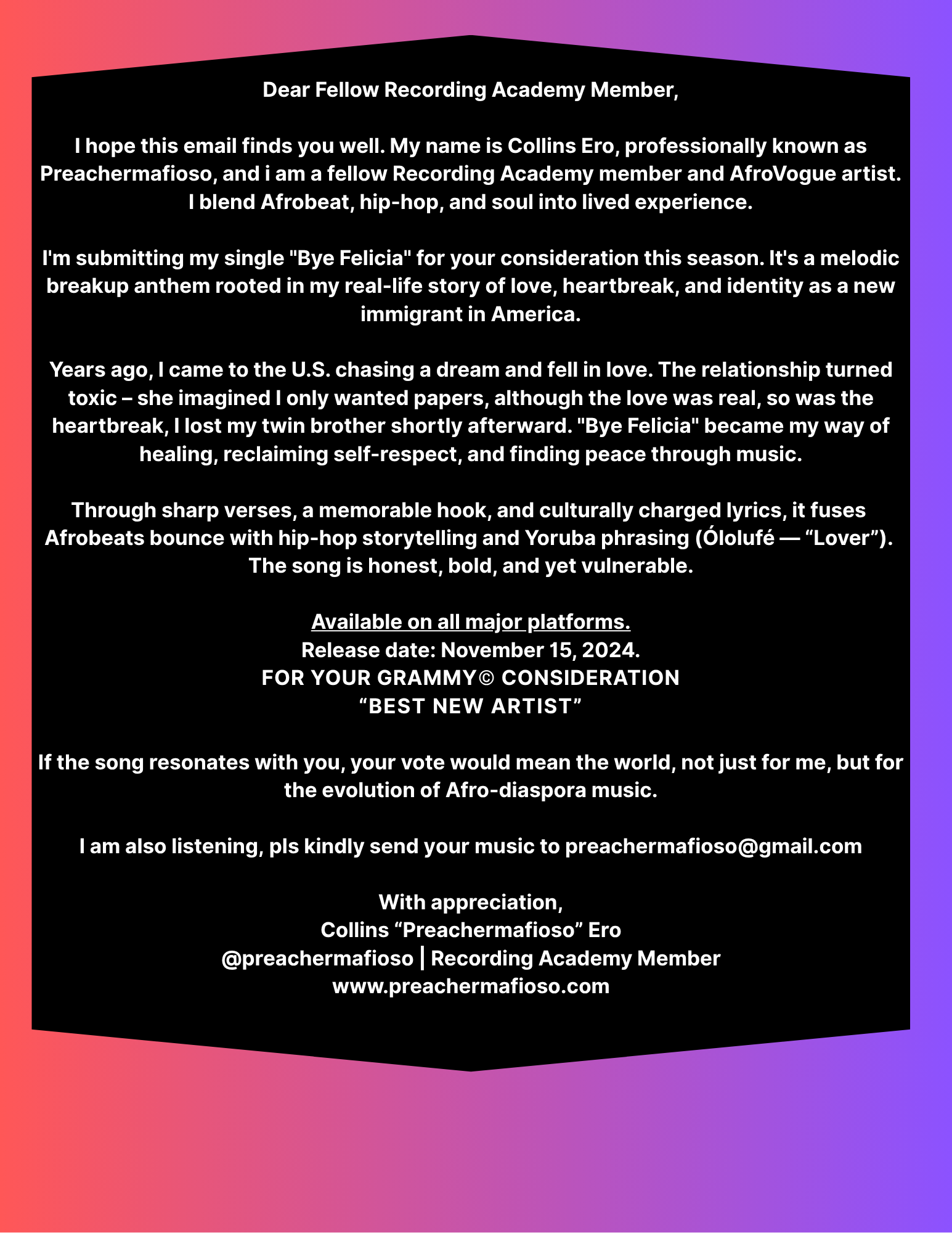 A significant milestone in his career is becoming a voting member of the Recording Academy. PreacherMafioso’s future ambitions include pioneering his own sub-genre of Afrobeat AfroVogue, and winning the prestigious Grammy Awards.